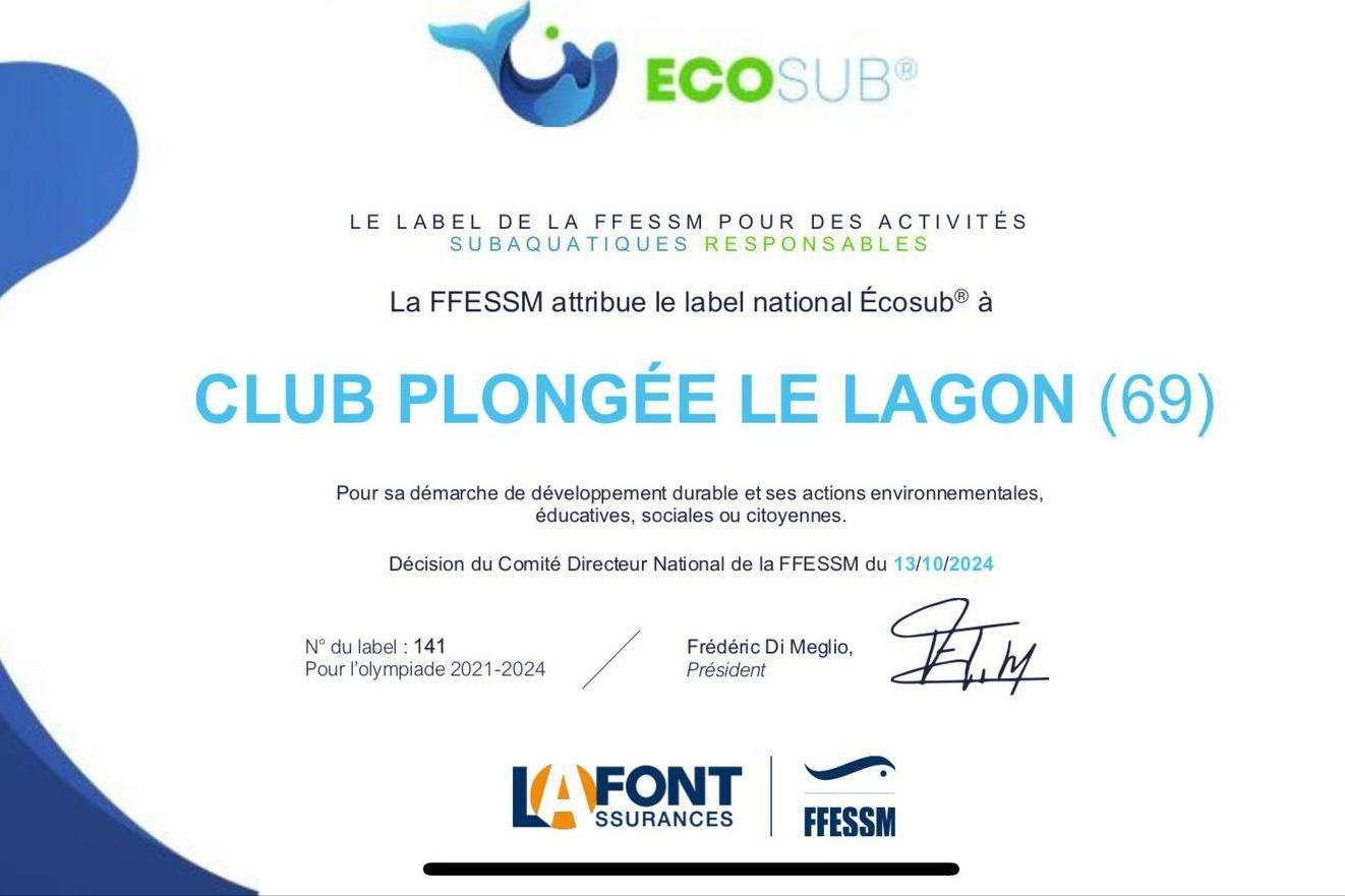 Notre club est fier d’avoir obtenu en octobre 2024 le label Ecosub® décerné par la FFESSM pour l’olympiade 2021-2024 !